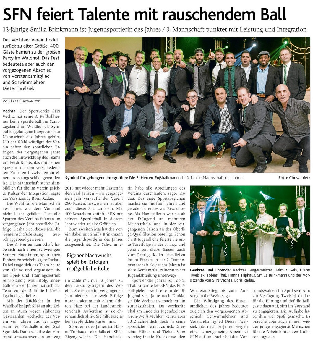 Beim diesjährigen Sportlerball des SFN Vechta wurde Tobias Thal zum Sportler und Hanna Triphaus zur Sportlerin des Jahres ausgezeichnet. Mannschaft des Jahres wurde die 3. Fußball-Herrenmannschaft. Für das Ehrenamt wurde Dieter Twelsiek ausgezeichnet.