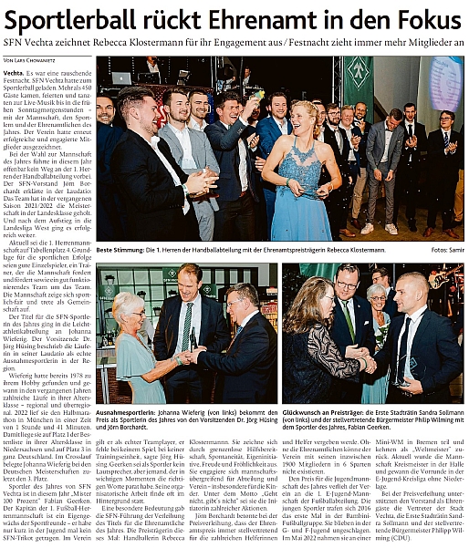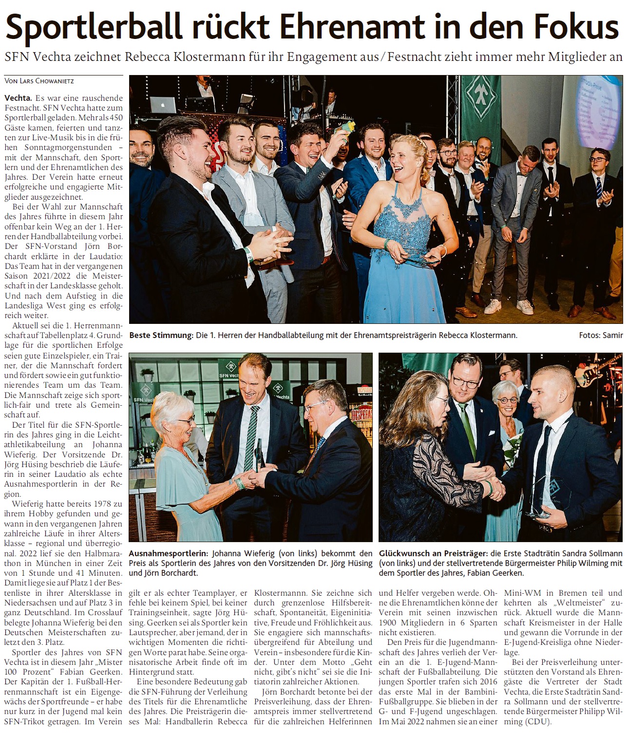 Beim diesjährigen Sportlerball des SFN Vechta wurde Fabian Geerken zum Sportler und Johanna Wieferig zur Sportlerin des Jahres ausgezeichnet. Mannschaft des Jahres wurde die 1.Handball-Herrenmannschaft. Für das Ehrenamt wurde Rebecca Klostermann ausgezeichnet.