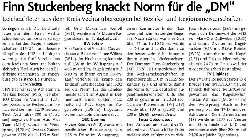 Am Samstag, den 21.05.2016 starteten sechs Leichtathleten des SFN Vechta um sich in einem starken Starterfeld bei den Regionsmeisterschaften in Löningen zu messen.